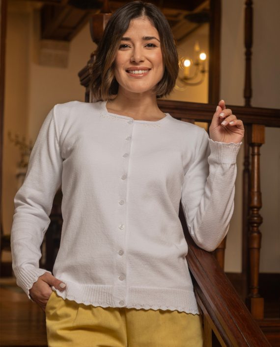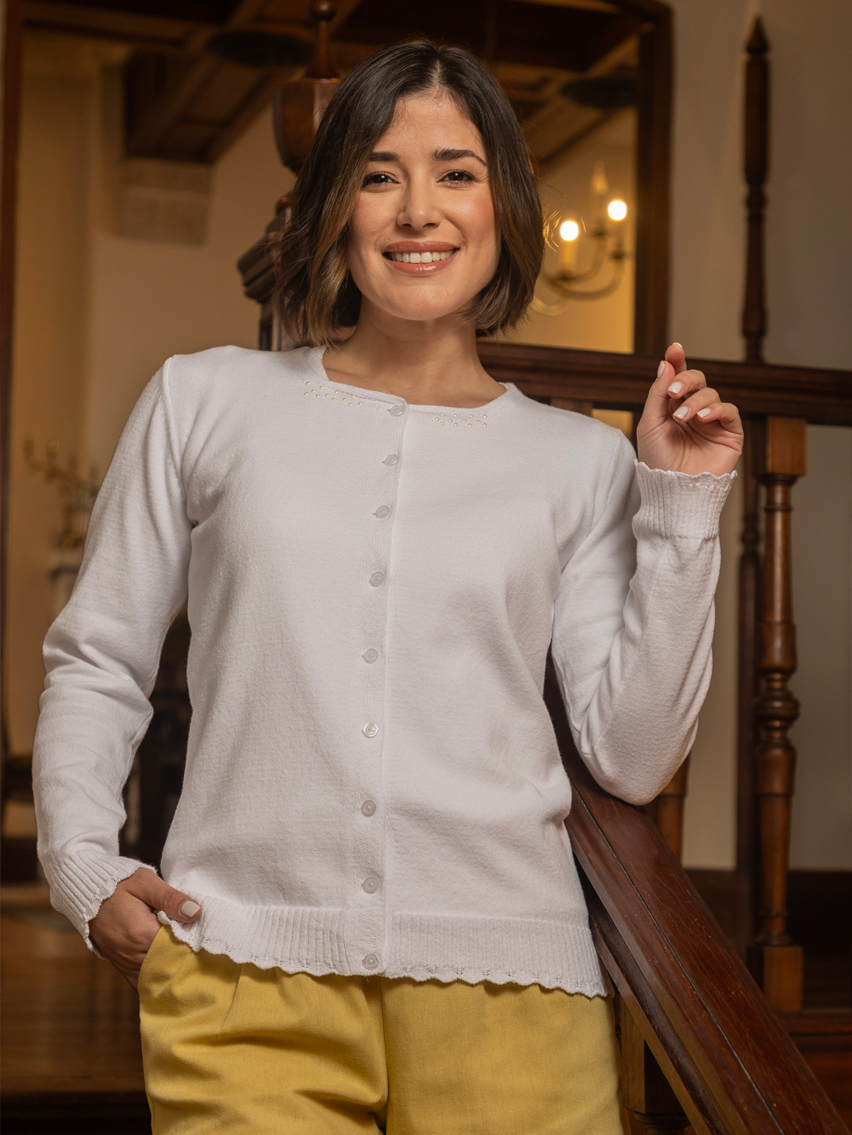 Artículo: 643Cárdigan con puño y elástico festoneado. Media perlas en escote.
