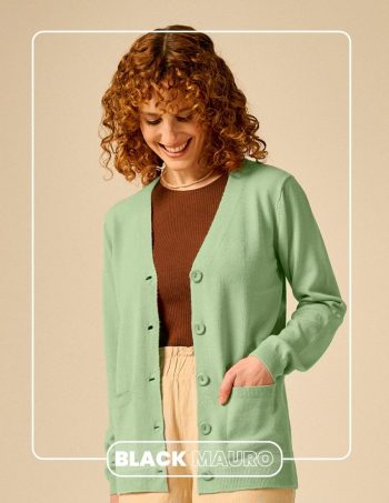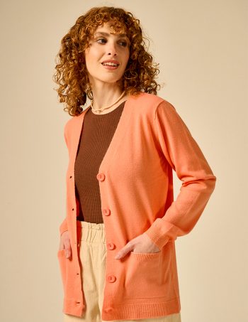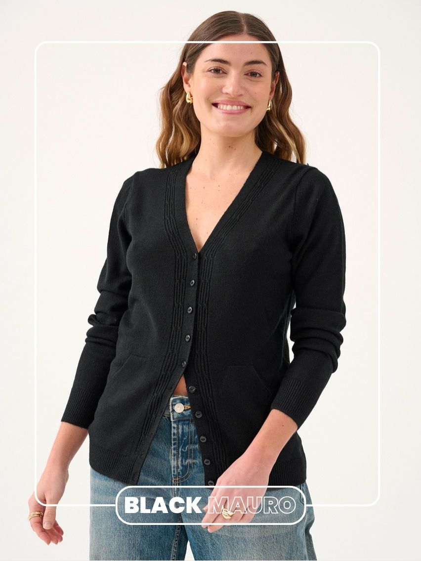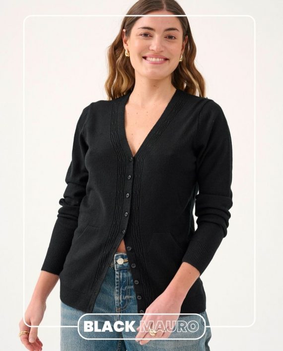 Saquito con botones y bolsillos. Detalle de tejido en trenzas