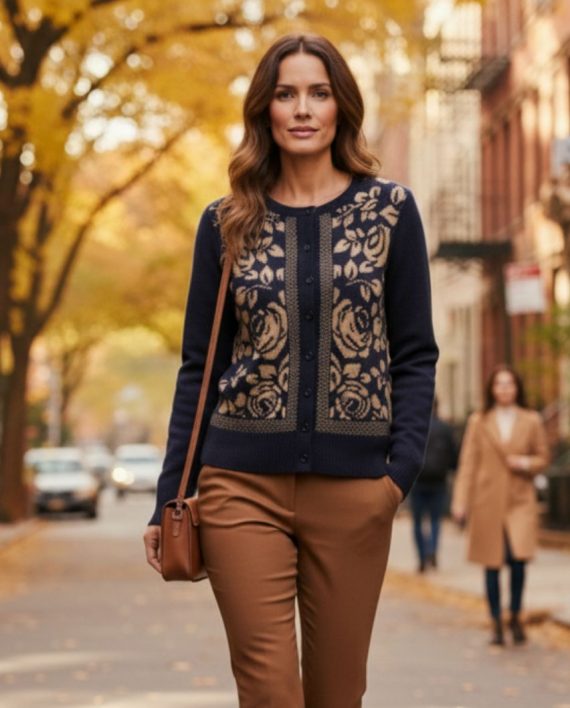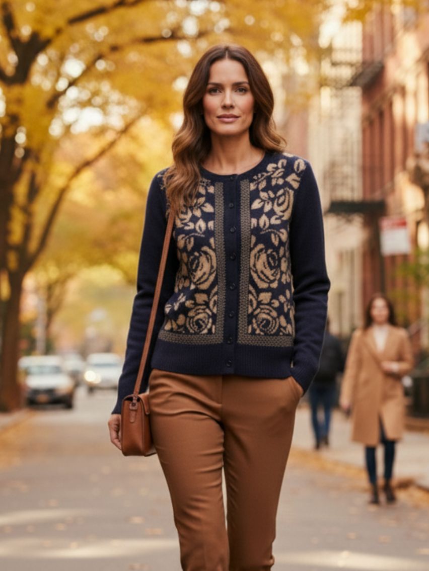 Cárdigan con jacquard de rosas y tachas en delantera.
