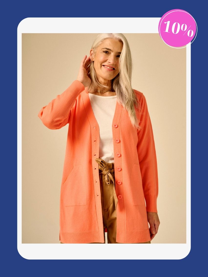 Saquito largo, con bolsillos. Detalle de tajos en los laterales.