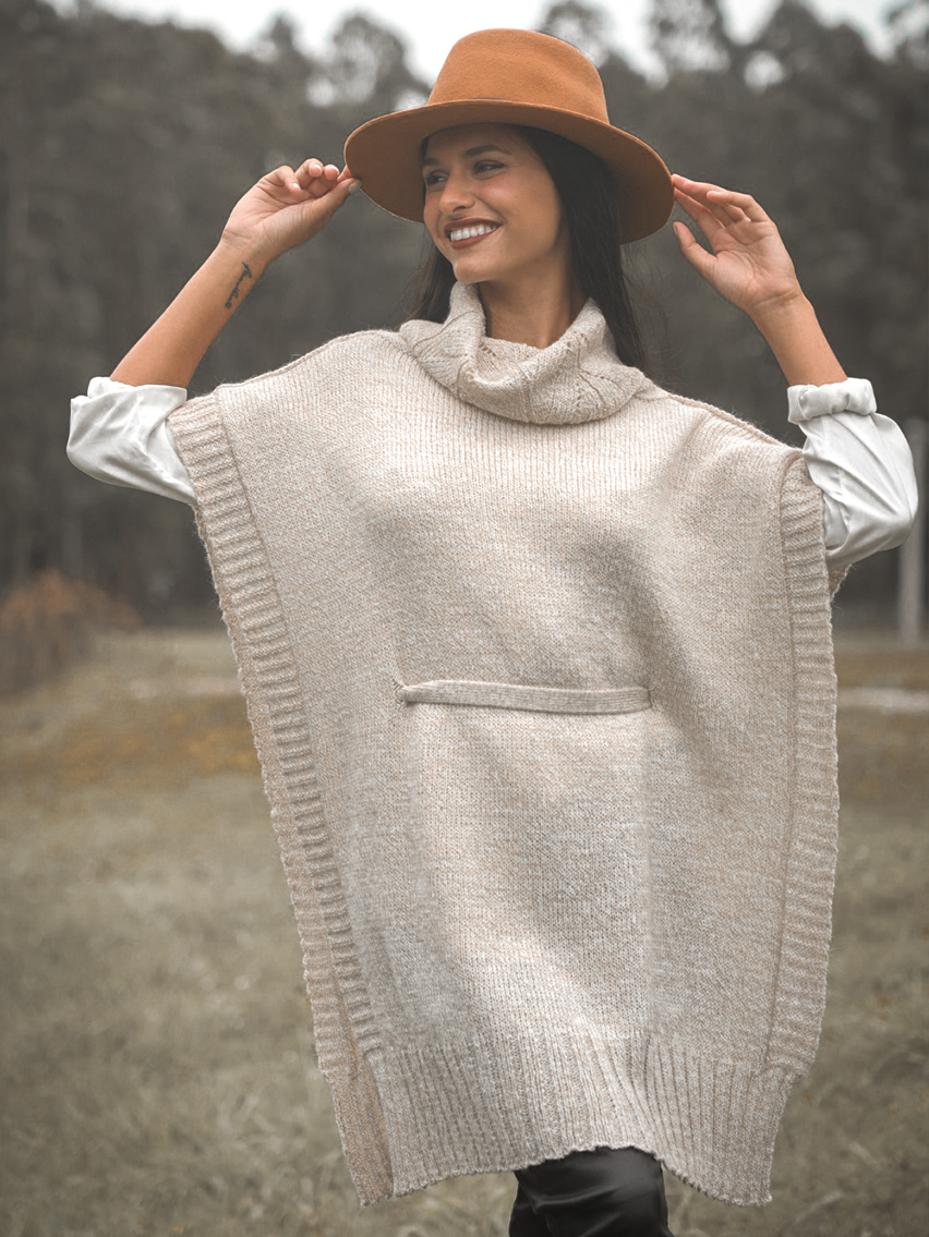 Poncho con cuello volcado y lazo.