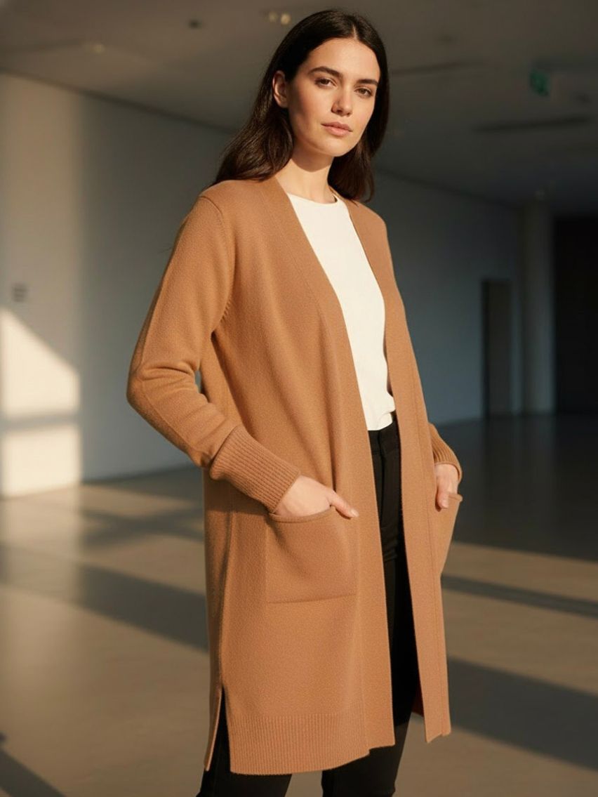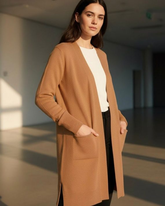 Artículo: 320Saco largo abierto con bolsillos y tajos laterales. Detalle de puño doblado.