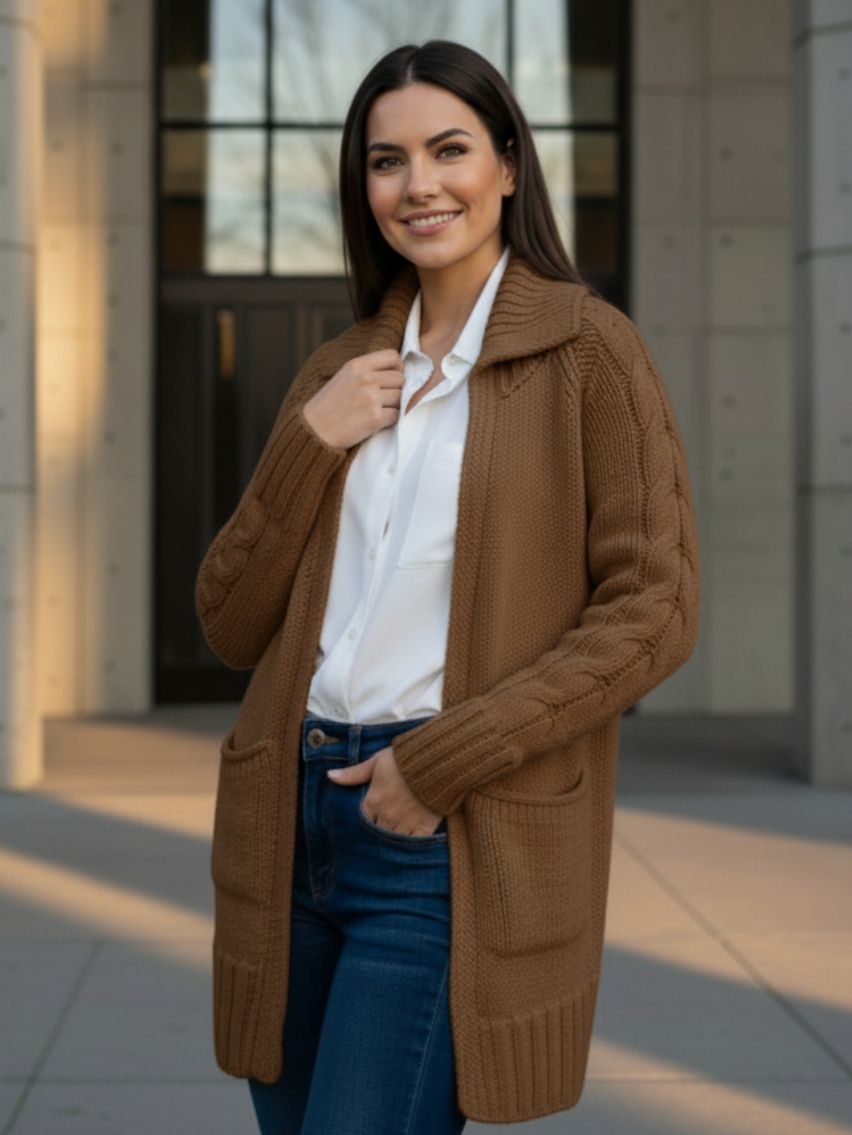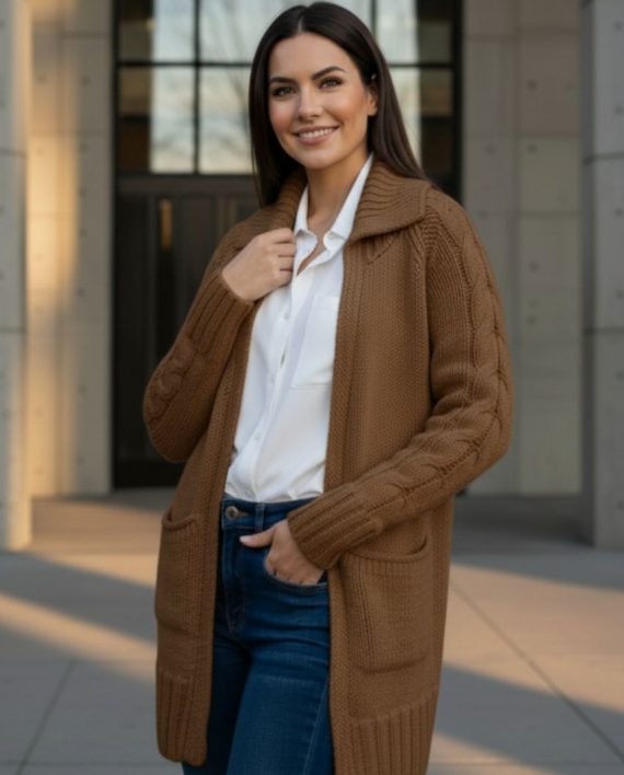 Artículo: 262Saco con cuello volcado y bolsillos. Manga con trenzas