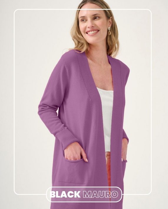 Saco largo abierto con bolsillos y tajos laterales. Detalle de puño doblado.