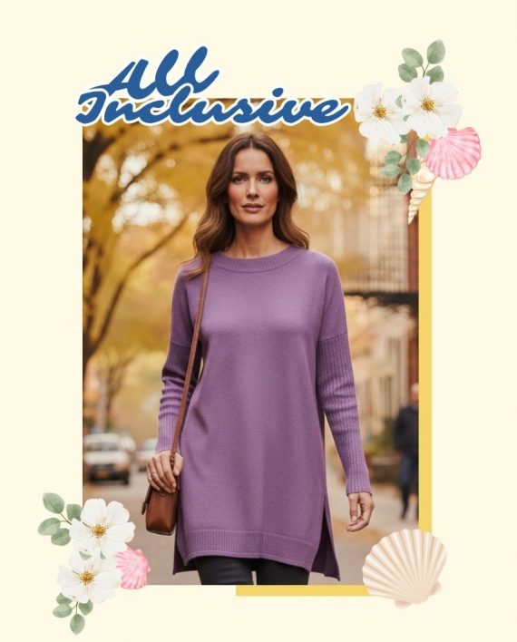 Sweater largo, cuello redondo con tajos laterales y mangas ajustadas.