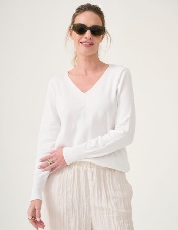 Artículo: 345Sweater escote en “v”, con tajos en los laterales. Diferencia de largo entre delantera y espalda.